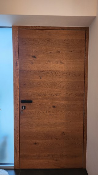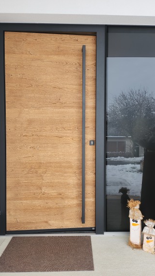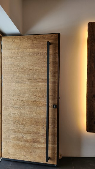 Mit ihrer warmen Holzoberfläche wirkt unsere Tür fast wie ein Möbelstück und setzt schon beim Ankommen ein klares Statement. Sie schafft Atmosphäre, noch bevor man das Haus betritt, und unterstreicht den Stil unseres Zuhauses bereits von außen.